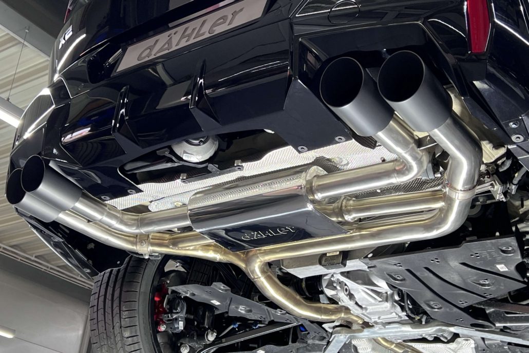 The dÄHLer exhaust system includes a high-flow, stainless-steel performance muffler and comes with exhaust valves by using the original BMW actuators.